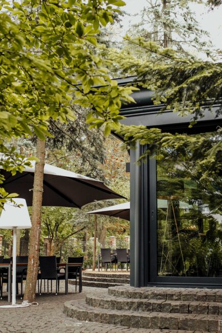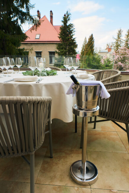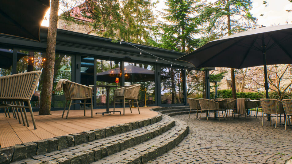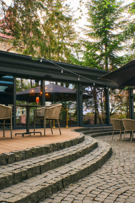 During the warm seasons, Lion’s Castle offers the opportunity to enjoy favorite dishes and drinks on its cozy open terrace. During the day, the terrace boasts a splendid view of the park, while in the evening, it’s very comfortable to sit among warm garlands under umbrellas.